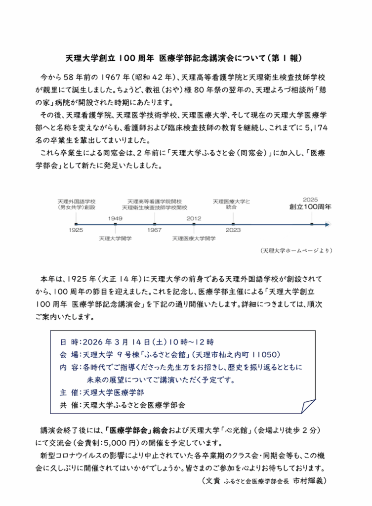 天理大学創立 100 周年 医療学部記念講会について(第 1 報) 公開日:2025年9月25日 医療学部会からのお知らせ 天理大学創立100周年医療学部記念講演会についてダウンロード 関連記事 部会長挨拶2025(令和7)年度 医療学部会 定期総会の電磁的議決権行使の結果(報告)部会長挨拶医療学部会 2025(令和7)年度 定期総会について第8回常任役員会 天理大学ふるさと会 医療学部会 議事録第6回常任役員会 天理大学ふるさと会 医療学部会 議事録 投稿ナビゲーション 第8回常任役員会 天理大学ふるさと会 医療学部会 議事録天理大学創立100周年医療学部記念講演会について(第2報/チラシ)
