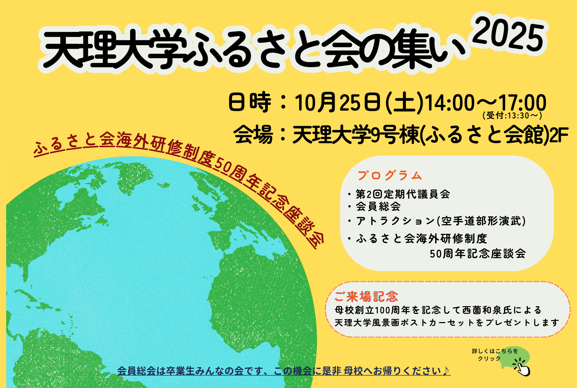 ㊗️天理大学創立100周年記念祝賀会 開催します 公開日:2025年9月18日 本会(お知らせ) 天理大学は2025年4月、創立100周年を迎えました。この記念すべき時をお祝いすべく記念祝賀会を開催いたします。皆さまお誘い合わせの上、母校100周年を一緒にお祝いしましょうお待ちしております☆彡申込締切10月3日(金) […] 続きを読む